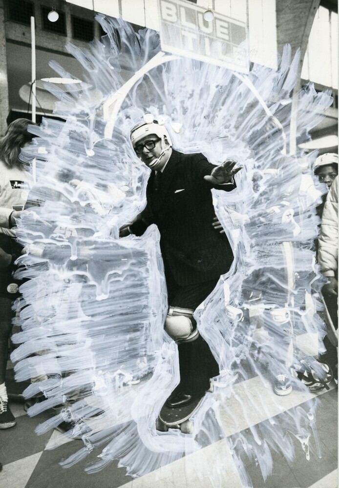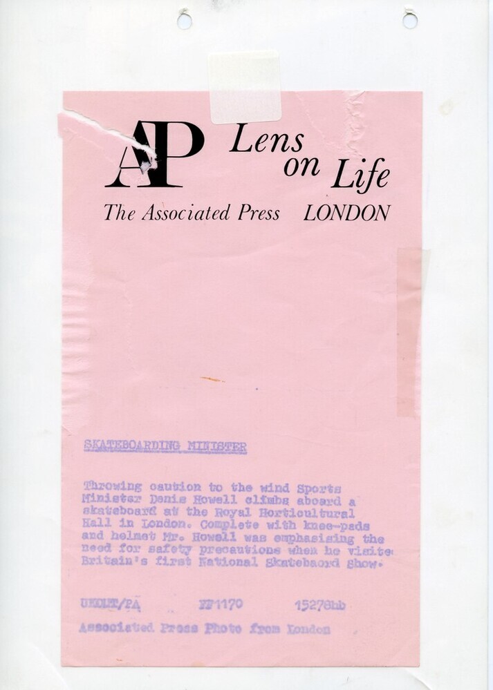Scope and ContentBlack and white photograph of Denis Howell, Minister for Sport, on a skateboard at first National Skateboard Show held at the Royal Horticultural Hall, London.