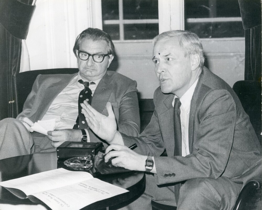 Scope and ContentBlack and white photograph of Tony Benn and Eric Heffer discussing the upcoming Labour Party conference in Brighton