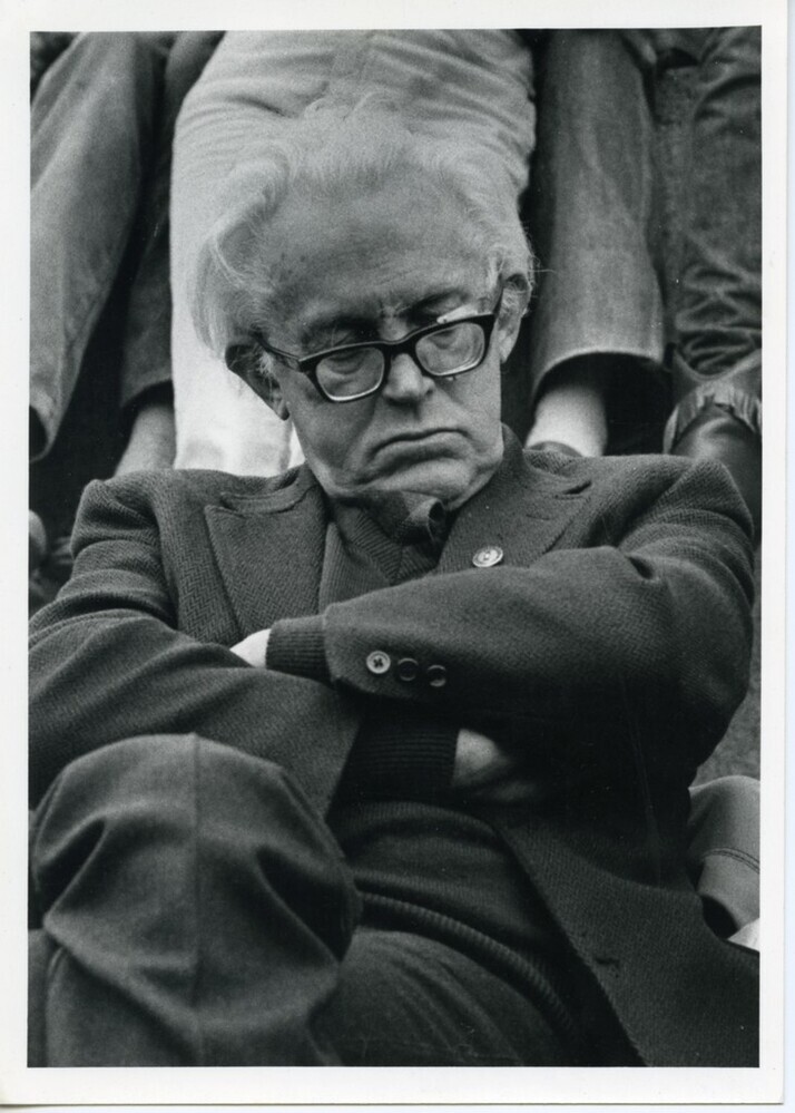 Scope and ContentBlack and white photograph of Michael Foot asleep at a Chile Solidarity Campaign rally in Trafalgar Square.
