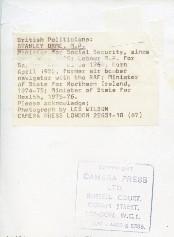 Scope and ContentBlack and white photograph of Stan Orme, MP and minister