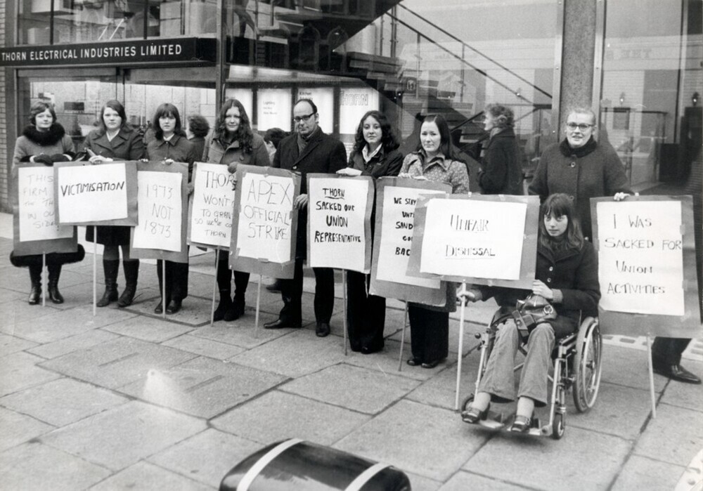 Scope and ContentBlack and white photograph of an APEX picket outside Thorn Electrical Industries head office in London protesting following an arbitrary sacking in Grantham.