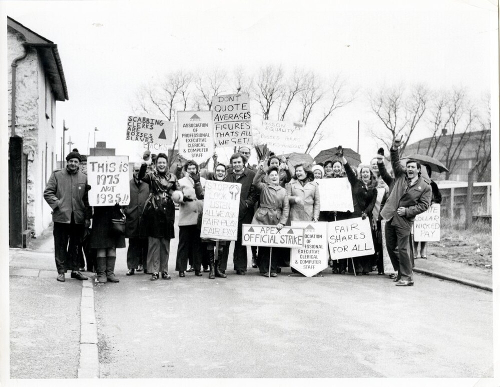 Scope and ContentBlack and white photograph of a picket by APEX members outside Pegson Limited at Coalville, near Leicester, over improved salaries and equal pay arrangements
