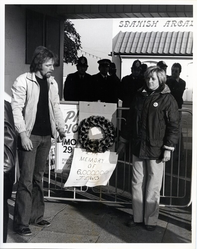 Scope and ContentBlack and white photograph of two members of the Trades Council observe one minutes silence after laying a wreath in memory of 6 million Jews who died in World War Two