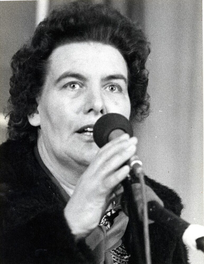 Scope and ContentBlack and white photograph of Sylvia Jones, President of Wales Trades Union Congress, speaking at a mass rally in Cardiff in support of steel workers