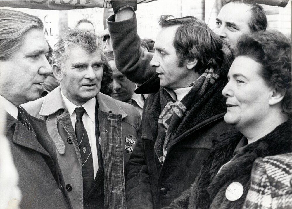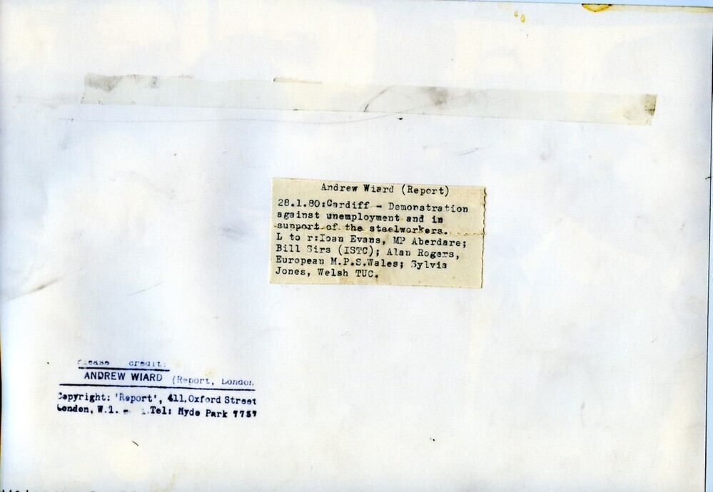 Scope and ContentBlack and white photograph of protesters at a demonstration in Cardiff against unemployment and in support of the steelworkers. L-R: Ioan Evans (MP for Aberdare), Bill Sirs (ISTC), Allan Rogers (MEP for South Wales) and Sylvia Jones (Wales TUD)