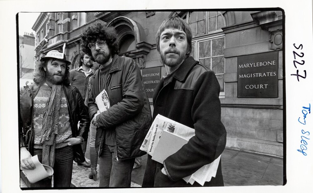 Scope and ContentBlack and white photograph of squatters supporters outside Marylebone Magistrates Court during Huntley Street eviction cases. Piers Corbyn is in the centre