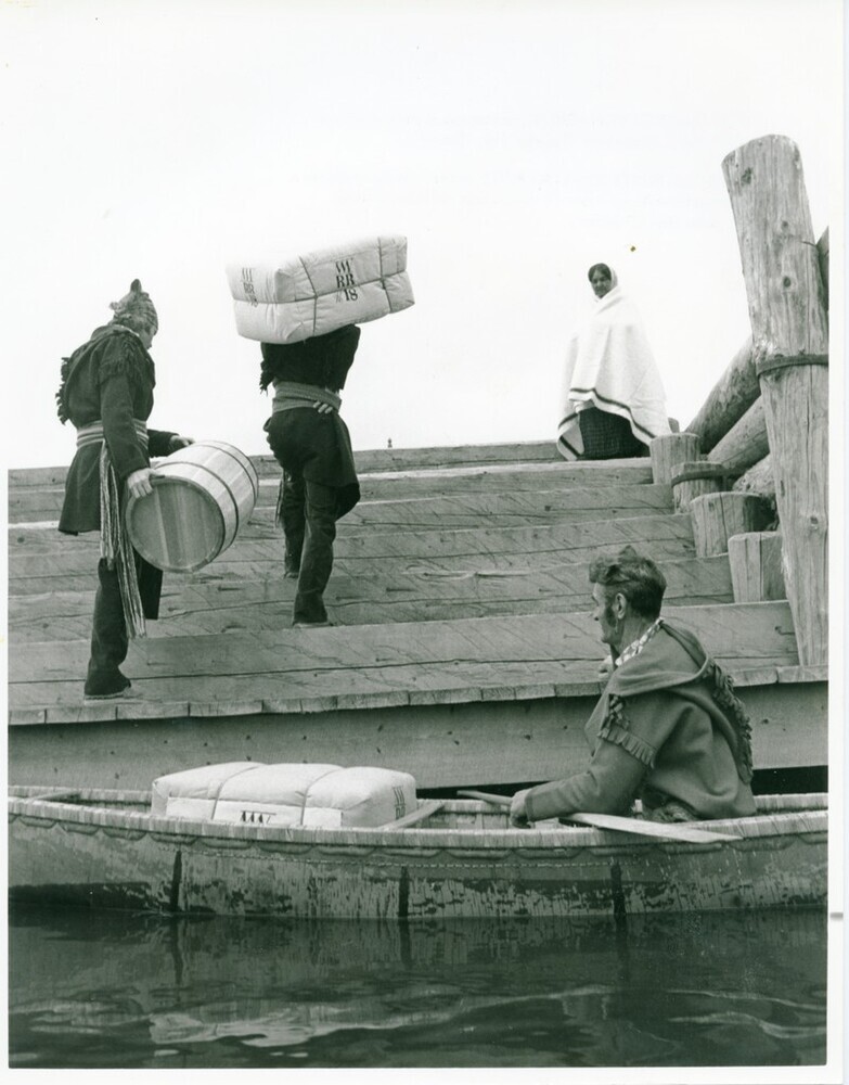 Scope and ContentBlack and white photograph of fur trading voyagers meeting at Old Fort William near Thunder Bay, Ontario, Canada