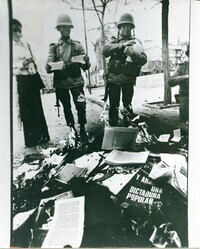 Scope and ContentBlack and white photograph of Chilean soldiers burning books after the military coup in Sep 1973 which overthrew President Allende