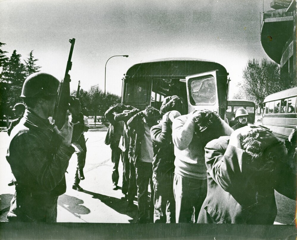 Scope and ContentBlack and white photograph of a group of prisoners with armed guards after the overthrow of President Allende in Chile.