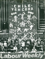 Scope and ContentBlack and white photograph of Hortensia Bussi, widow of President Salvador Allende, speaking at a Chile Solidarity Rally, Central Hall, Westminster on the second anniversary of his overthrow. There is a large Chile Vencera (Chile will win) banner in the background