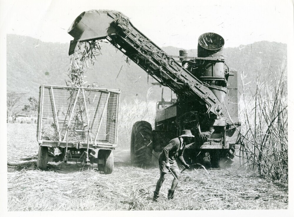 Scope and ContentBlack and white photograph of a sugar cane cutting machine near Cairns, Queensland, with a worker in the foreground