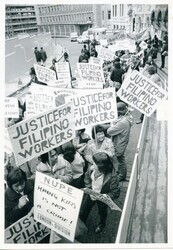Scope and ContentBlack and white photograph of a demonstration against the deportation of Filipino workers. Many protesters are holding placards and there are several banners in the background