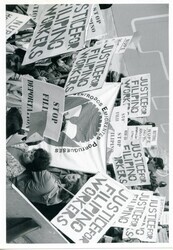 Scope and ContentBlack and white photograph of a demonstration against the deportation of Filipino workers. Many protester are holding placards.