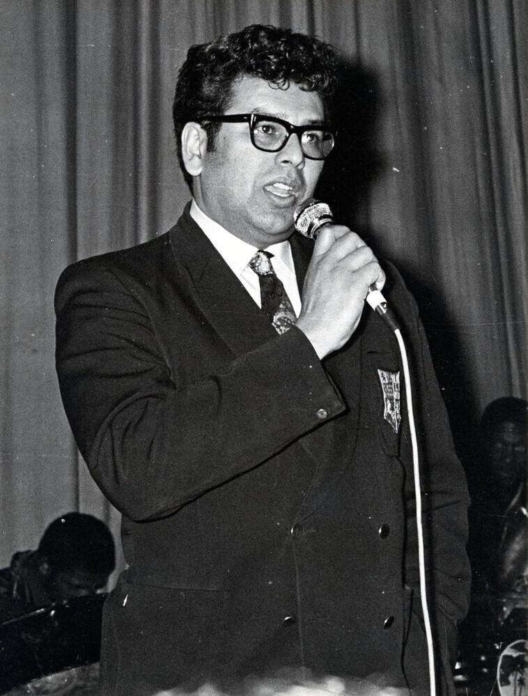 Scope and ContentBlack and white photograph of Rudy Narayan, barrister and civil rights activist, speaking into a microphone