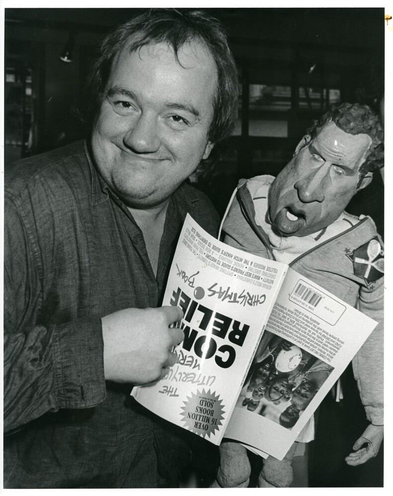 Scope and ContentBlack and white photograph of Mel Smith, British actor and comedian, holding a copy of the Comic Relief Christmas Book and Spitting Image puppet