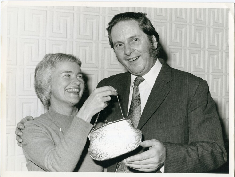 Scope and ContentBlack and white photograph of John Timpson, BBC presenter, on being voted Male Chauvinist Pig of 1975, with Wyn Knowles, editor of 'Woman's Hour'.