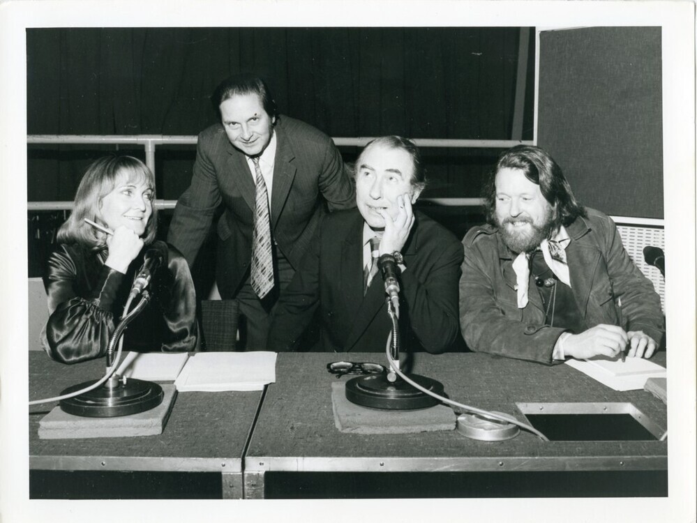 Scope and ContentBlack and white photograph of John Timpson, the chairman; Sheila Hancock, Peter Jones and William Rushton, the panellists, on the new Radio 4 panel game