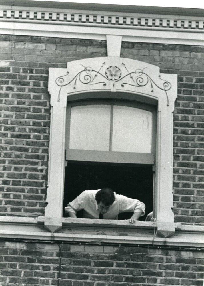Scope and ContentBlack and white photograph of a police surveillance officer looking out of a window, London