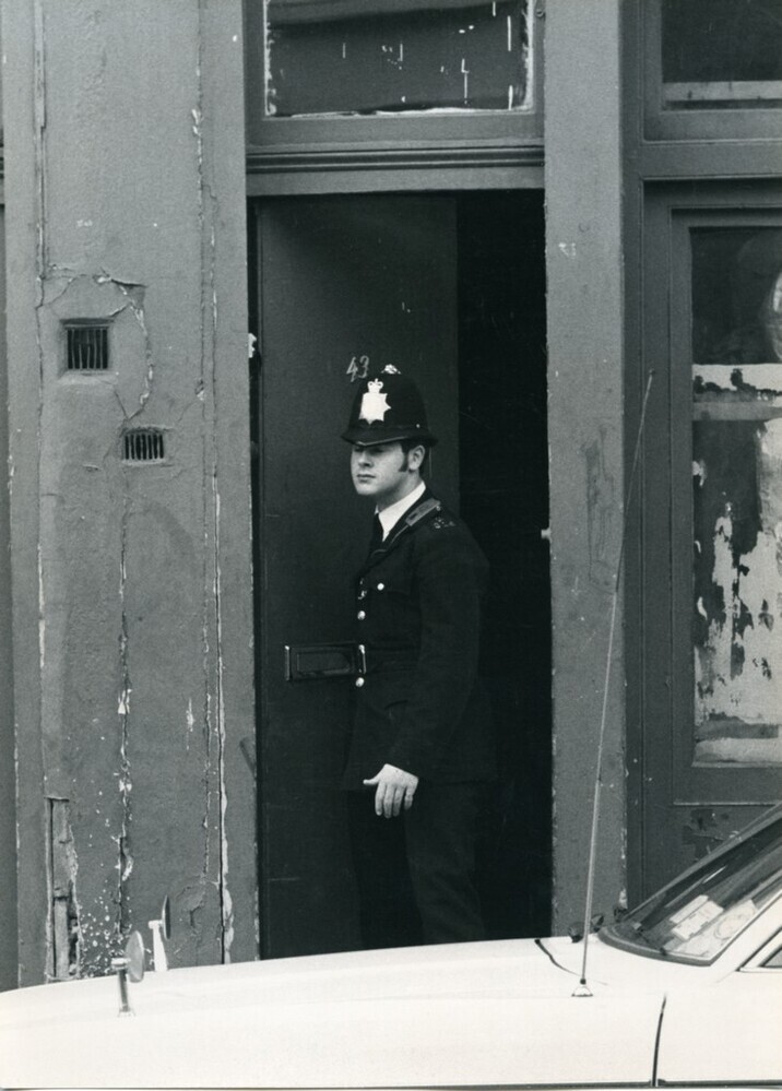 Scope and ContentBlack and white photograph of a uniformed police officer standing in the doorway of premises being used by surveillance officer, London