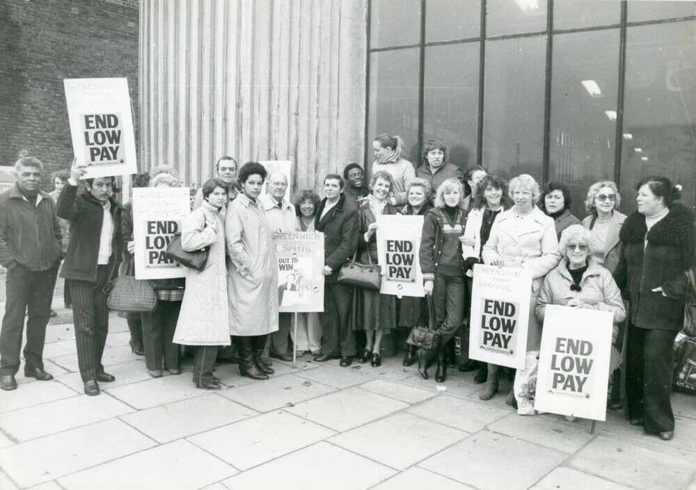 Scope and ContentBlack and white photograph of a group of people protesting about low pay at Greenwich District Hospital, London