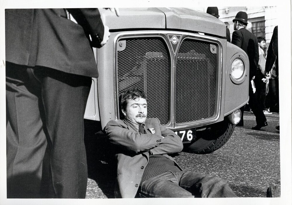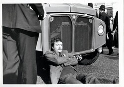 Scope and ContentBlack and white photograph of a protester sitting on ground in front of a London bus
