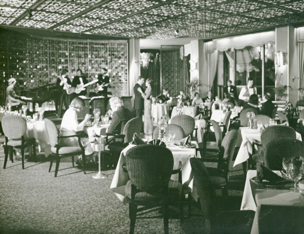 Scope and ContentBlack and white photograph of guests eating in a hotel restaurant with couple dancing and group playing in background