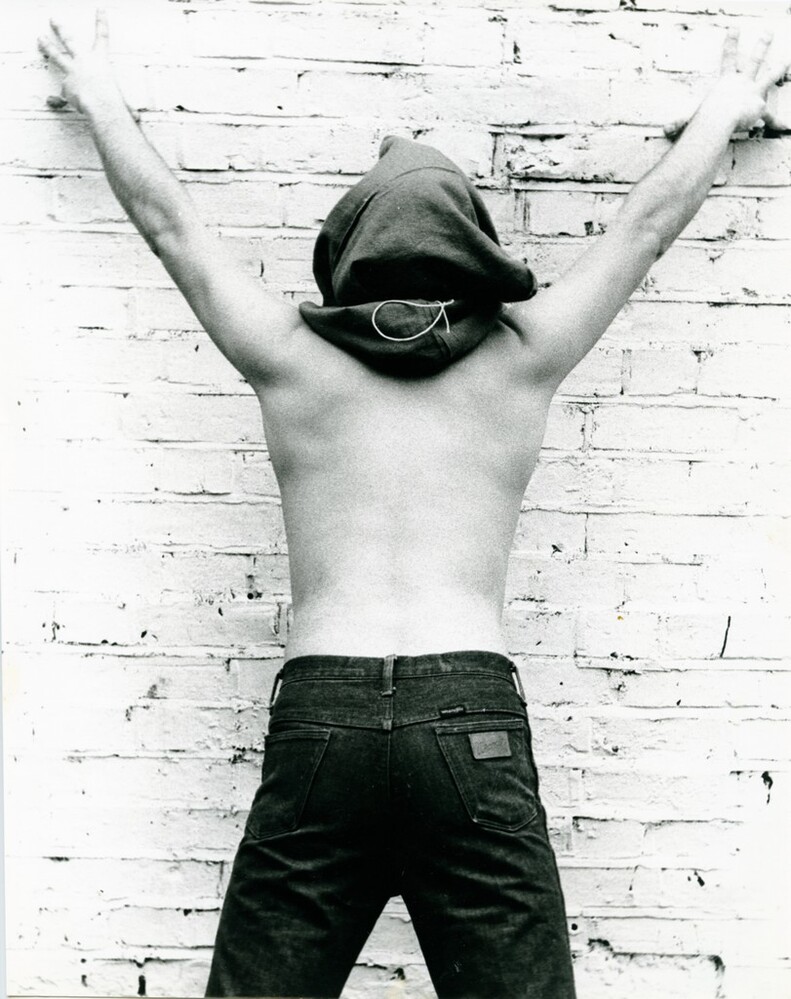 Scope and ContentBlack and white photograph of a man with a hood over his head spreadeagled against a wall