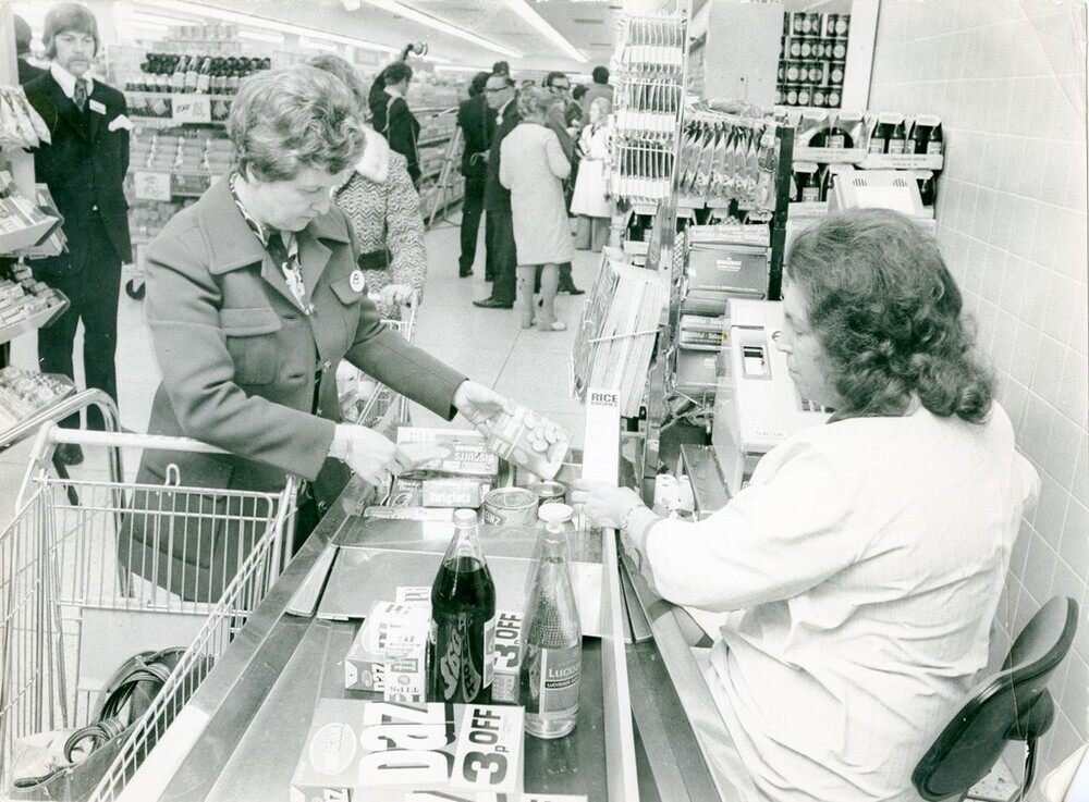 Scope and ContentBlack and white photograph of women at Tesco supermarket checkout. There are other shoppers in the background