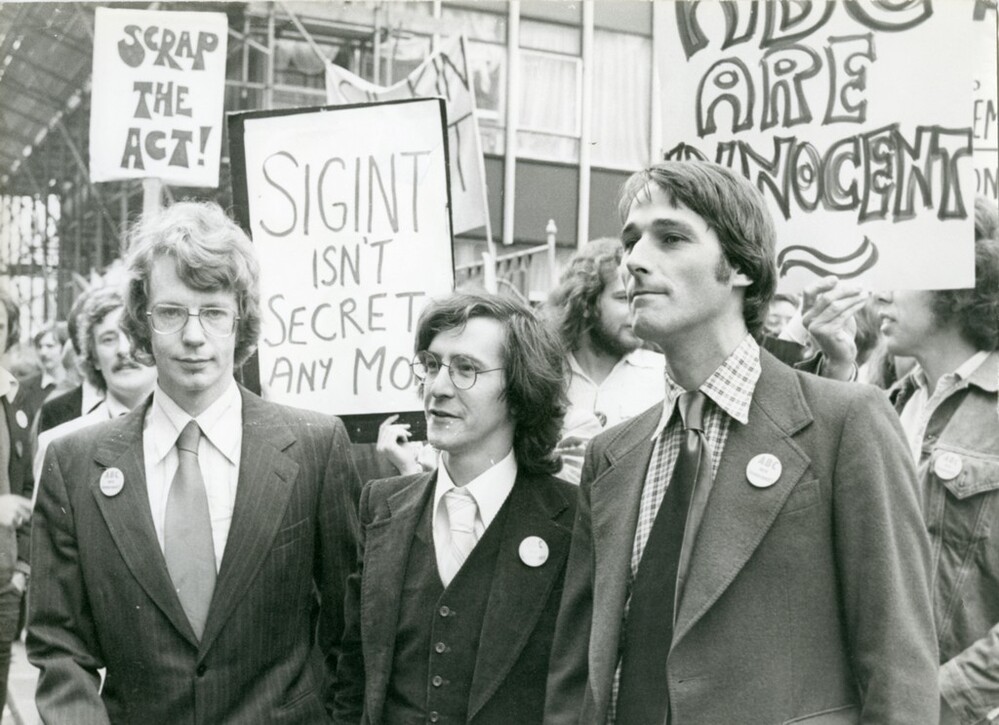 Scope and ContentBlack and white photograph of the three defendants, Crispin Aubrey, John Berry and Duncan Campbell, with protesters, outside the Old Bailey during their trial for wrongful communication of security information
