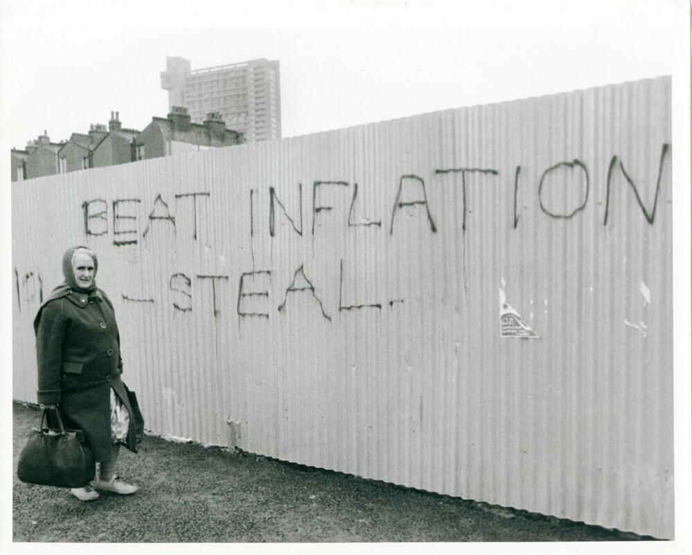 Scope and ContentBlack and white photograph of a woman standing by a corrugated iron fence in the Westbourne Park area, London graffitied with: Beat Inflation - Steal