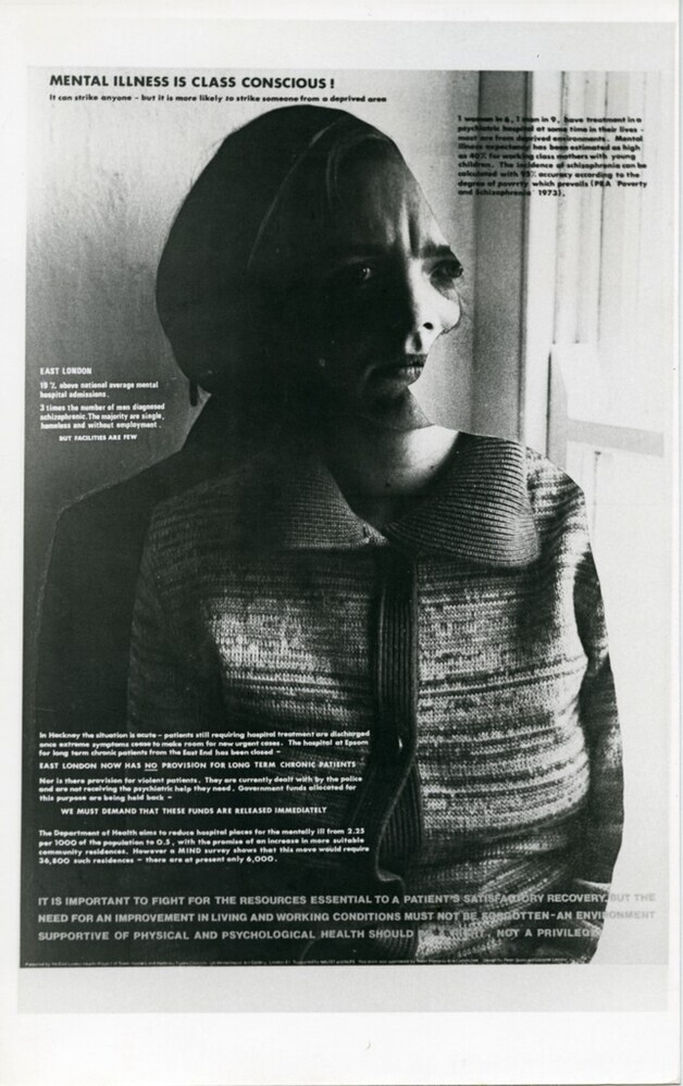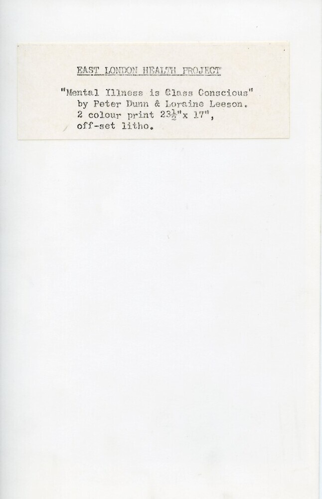 Scope and ContentBlack and white photograph of a 'Mental Illness is Class Conscious', poster by Peter Dunn and Loraine Leeson for East London Health Project