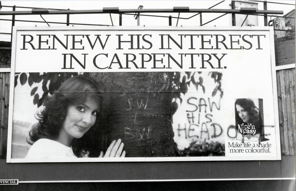 Scope and ContentBlack and white photograph of a graffitied billboard, Finsbury Park, London. The original wording of 'Renew his interest in carpentry' has been supplemented with the words: Saw his head off