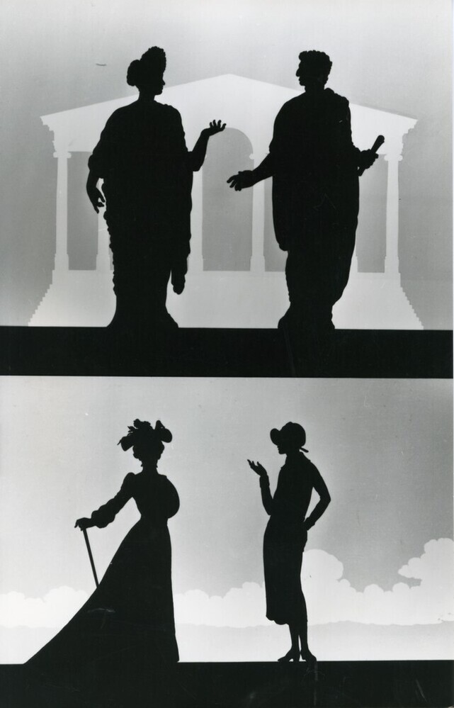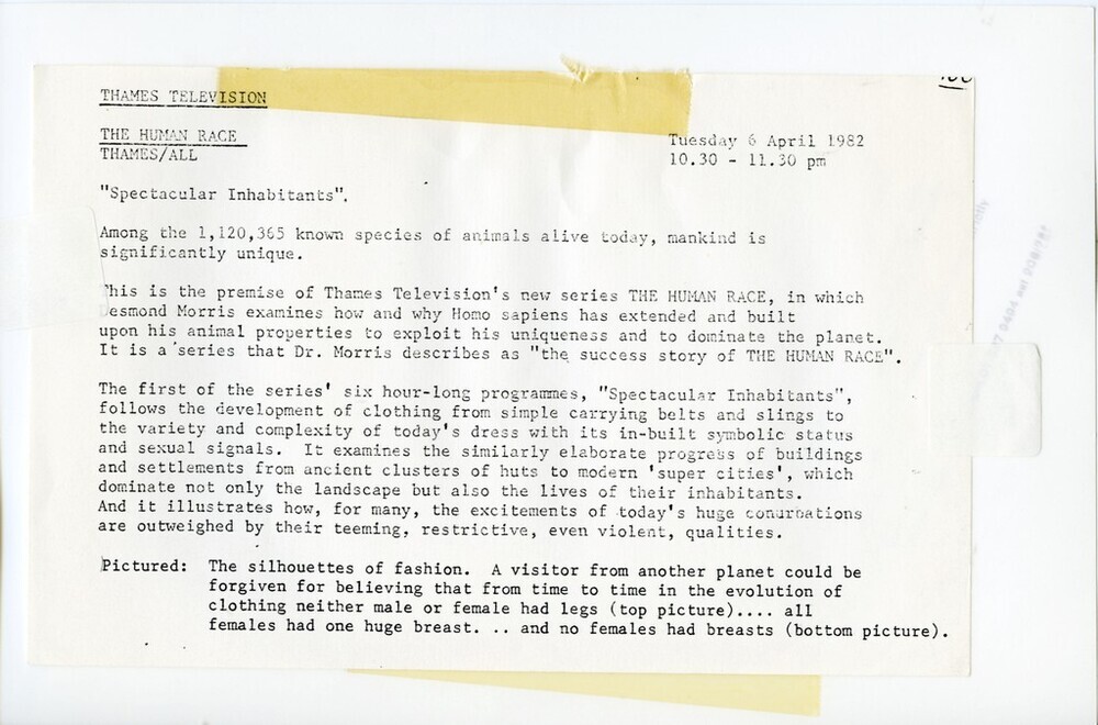 Scope and ContentBlack and white photograph of a still - the silhouettes of fashion - advertising the first episode of Thames Television's six part series 'The Human Race' presented by Dr Desmond Morris.
