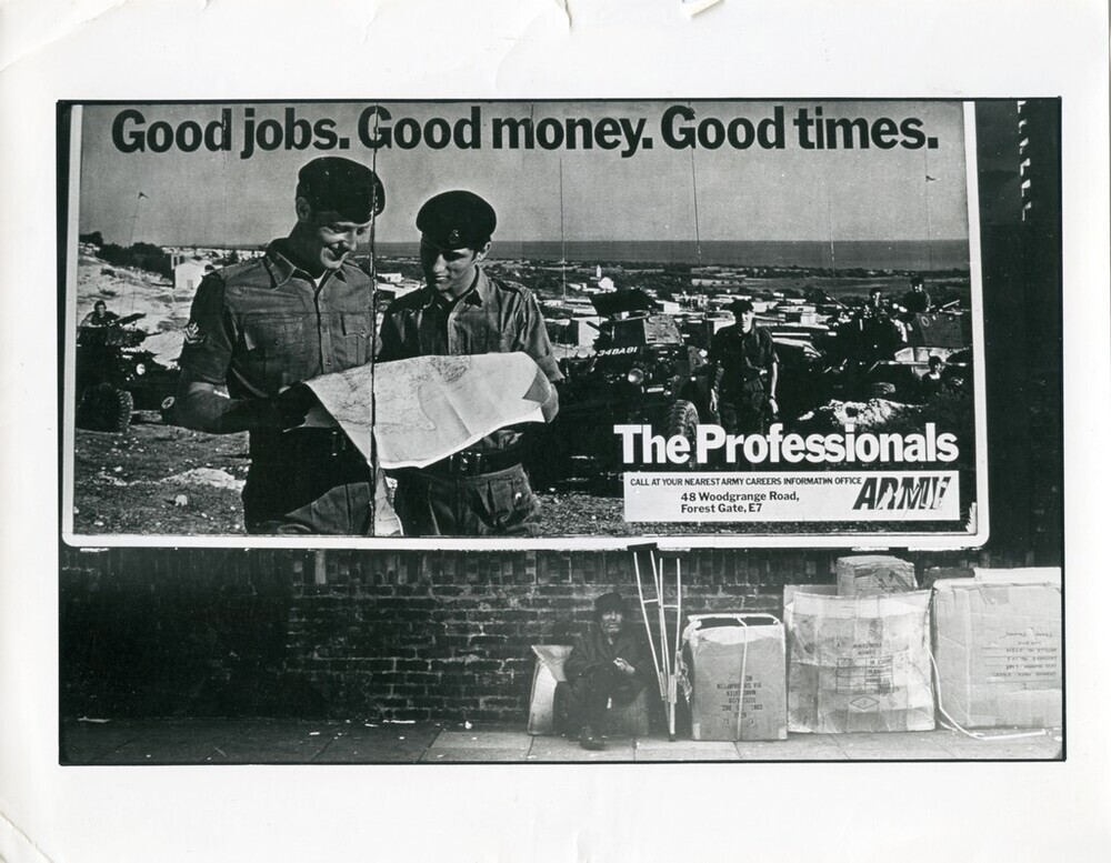 Scope and ContentBlack and white photograph of a British Army recruitment billboard with an elderly man sitting under the hoarding. There are a pair of crutches and a number of cardboard boxes beside him