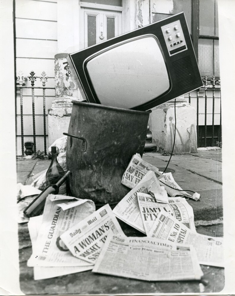 Scope and ContentBlack and white photograph of a rubbish bin in street with a television in it and copies of newspapers around it.