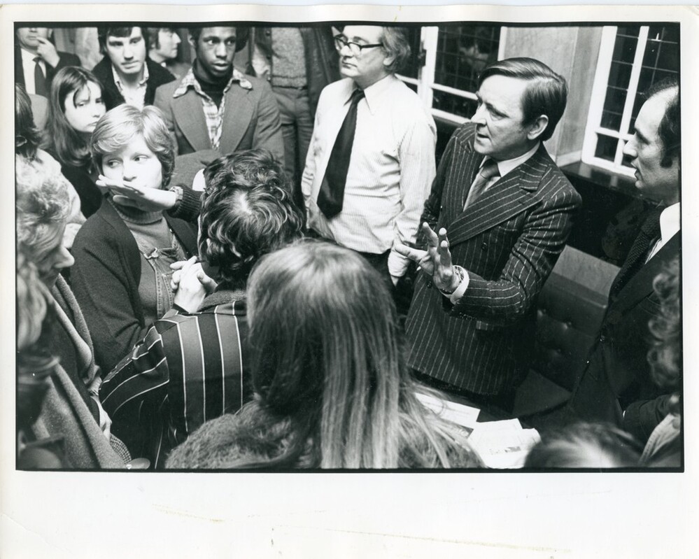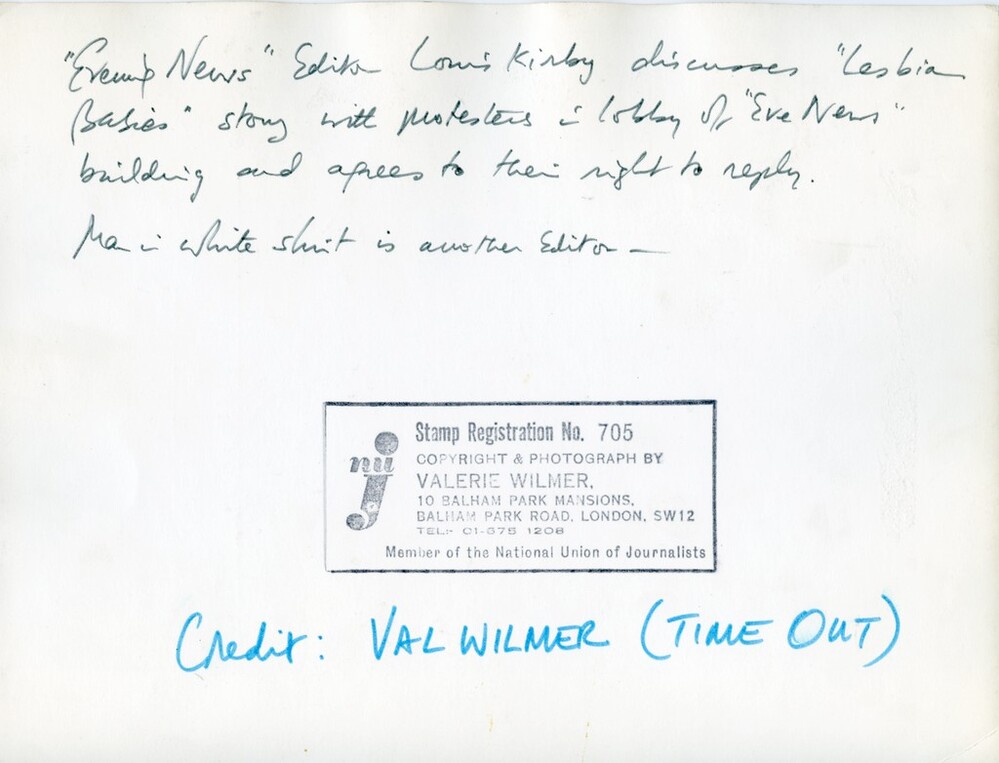 Scope and ContentBlack and white photograph of Evening News editor, Louis Kirby, discussing their 'Lesbian Babies' story with protesters and agreeing to their right of reply.