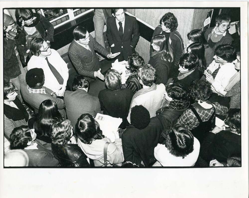 Scope and ContentBlack and white photograph of Evening News editor, Louis Kirby, discussing the 'Lesbian babies' story with protesters in the lobby of the Evening News building.