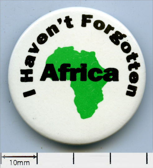 Scope and ContentTin badge with an image of a map of Africa and the text: I haven't forgotten Africa. Oxfam