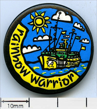 Scope and ContentTin badge with an image of a ship and the text: Rainbow Warrior