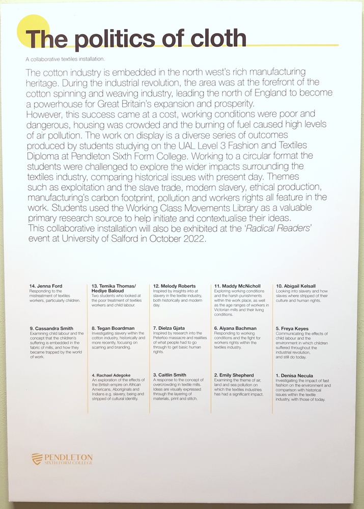 Scope and ContentWorks created by students studying on the UAL Level 3 Fashion and Textiles Diploma at Pendleton Sixth Form College. The works explore the wider impacts surrounding the textiles industry, comparing historical issues with present day. Themes such as exploitation and the slave trade, modern slavery, ethical production, manufacturing's carbon footprint, pollution and workers rights all feature in the work.