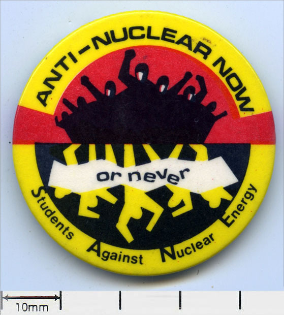 Scope and ContentTin badge with an image of a group of people and the text: Anti-nuclear now, or never. Students Against Nuclear Energy