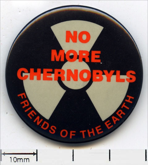 Scope and ContentTin badge with an image of a nuclear symbol and the text: No more Chernobyls. Friends of the Earth