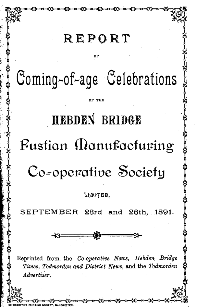 Report of the coming-of-age celebrations of the Hebden Bridge Fustian Manufacturing Co-operative Society Limited - September 23rd and 26th, 1891