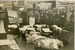 Scope and ContentBlack and white photograph of a group of men staging a lie-down protest in Oxford Street, London. There is a car in the background and they are surrounded by onlookers