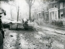 Scope and ContentBlack and white photograph of the wreckage of MP Hugh Fraser's car outside his house in Campden Hill Square, Kensington, London.