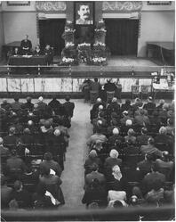 Scope and ContentBlack and white photograph of a meeting with a large portait of Stalin on the stage, with flowers below. The four speakers are off to one side