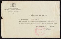 Scope and ContentSafe conduct pass for travel to Barcelona and back issued by the International Brigades