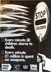 Scope and ContentPoster with an image of a Stop Children sign about to be hit by a large number of nuclear weapons and the text: Every minute 30 children starve to death. Every minutes £1 is spent on weapons.