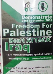 Scope and ContentPoster with the text: Demonstrate 28th September 2002. Freedom for Palestine. Don't attack Iraq. 12.30 from Embankment to Hyde Park, London