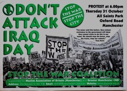 Scope and ContentPoster with an image of a Stop the war demonstration and the text: Don't attack Iraq day. Stop the war. Stop the city. Protest at 6.00pm Thursday 31 October, All Saints Park, Oxford Road, Manchester.